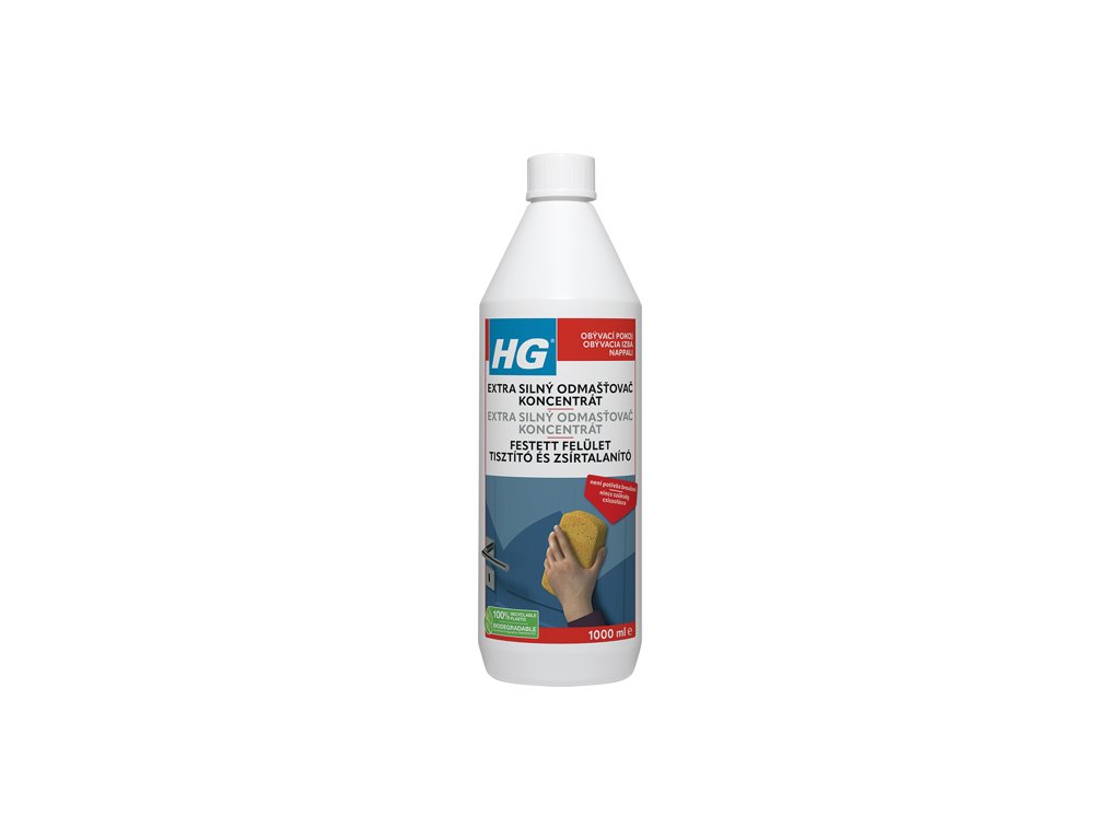 HG Extra silný odmasťovač koncentrát (HG „maľovanie bez brúsenia“) pripraví povrchy na nový náter rýchlo a profesionálne. Hlboko odmastí a vyčistí staré nátery aj surové podklady, takže nie je potrebné brúsenie. Výborne si poradí aj so škvrnami od nikotínu a atmosférického znečistenia. Vďaka koncentrovanému zloženiu je produkt úsporný a bez nepríjemného amoniakového zápachu.