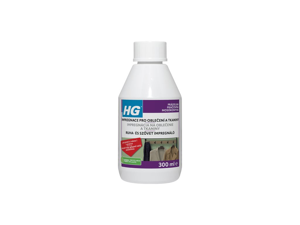 HG Impregnácia na oblečenie a tkaniny vytvára na vláknach neviditeľnú vodoodpudivú vrstvu, ktorá zároveň zmenšuje priľnavosť špiny. Odevy a textílie ostanú dlhšie čisté, rýchlejšie schnú a ľahšie sa udržiavajú. Použiteľná na každodenné odevy aj bytové textílie zo 100 % bavlny, ľanu, vlny alebo zmesí týchto materiálov.