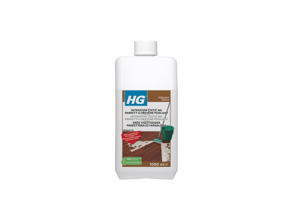 HG Intenzívny čistič na lakované parkety (HG 55) je formulovaný tak, aby účinne čistil a pritom bol 100 % bezpečný pre lakovanú vrstvu. Poradí si s mastnotou, zažratou špinou a dokáže odstrániť aj lesklé/emulzné ochranné filmy (vrátane HG Ochranný film na lakované parkety s leskom – HG 51). Vhodný na pravidelné hĺbkové čistenie aj obnovu zanesených podláh.