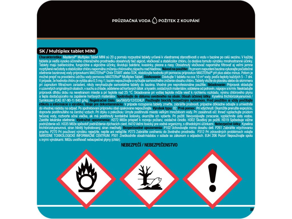 EUH206 - Pozor! Nepoužívajte spolu s inými výrobkami. Môžu uvoľňovať nebezpečné plyny (chlór).