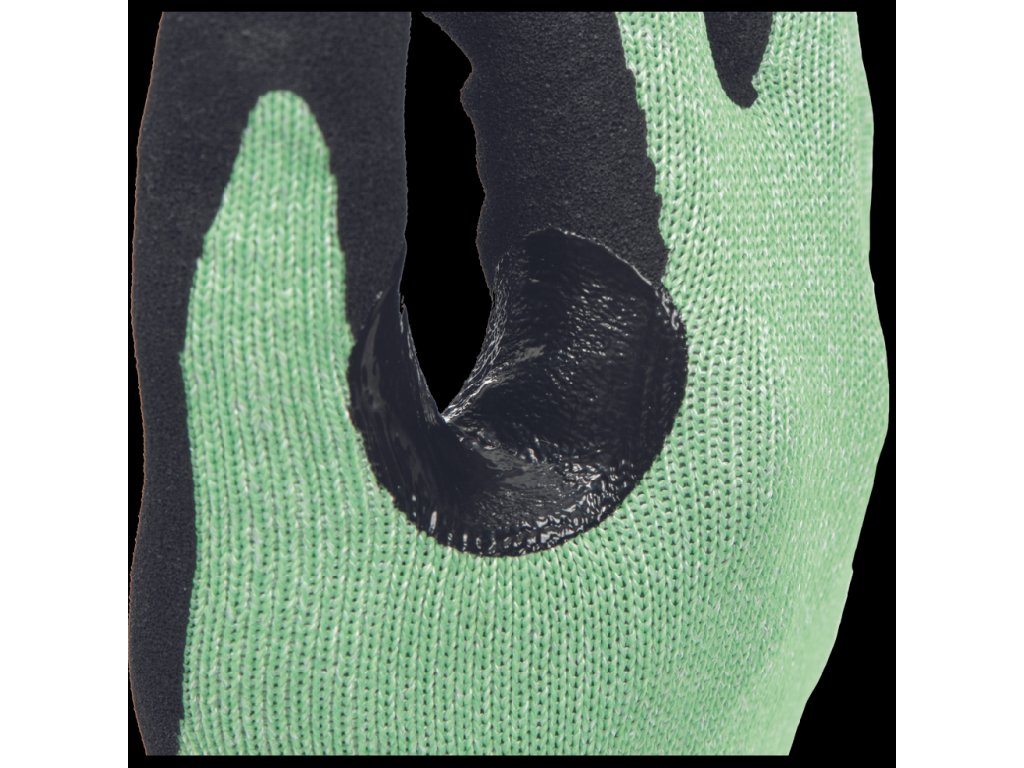 Bezšvové, vysoko odolné rukavice na prácu s ostrými a mastnými dielmi. Kombinácia rezne-odolného úpletu a mikroporézneho nitrilu v dlani/prstoch poskytuje excelentný úchop aj v oleji a maximálnu ochranu proti prerezaniu (úroveň F).